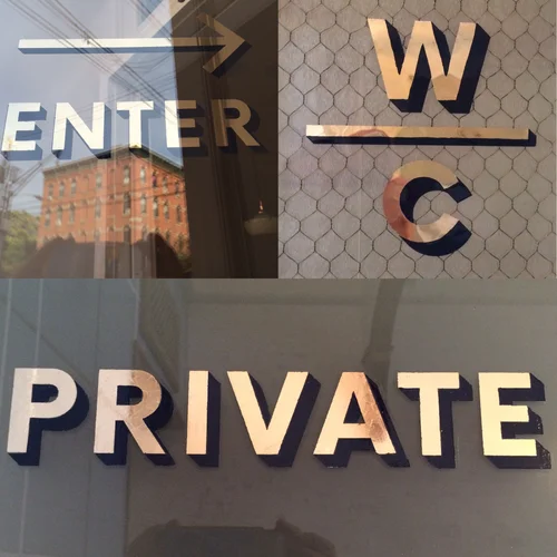 We believe in combining traditional craft with modern technology in response to current global retail demands- achieving beautiful and authentic results that are also affordable and practical. When Tiffany&Co asked us to conceive of a way to install our beautiful hand gilded signs on the entrance doors over 300+ stores world wide (without flying us everywhere) we were challenged... We then developed a special adhesive decal which can closely match any gilded sign using many different layers of tinted gold or silver on clear vinyl. These decals can be shipped anywhere in the world within days and come with simple instructions for local installation. This solution is great for smaller stores in airports or malls or for temporary pop-up stores.